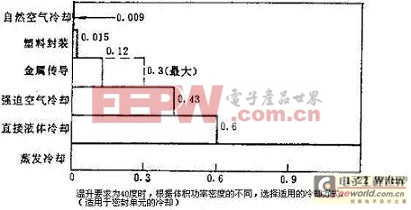 大部分热设计适用于上面这个图表,因为基本上散热都是通过面散热。但对于密封设备,则应该用体积功率密度来估算,热功率密度=热量 / 体积。下图(图2)是温升要求不超过40℃时,不同体积功率密度所对应的散热方式。比如某电源调整芯片,热耗为0.01W,体积为0.125cm3,体积功率密度=0.1/0.125=0.08W/cm3,查下图得出金属传导冷却可满足要求。