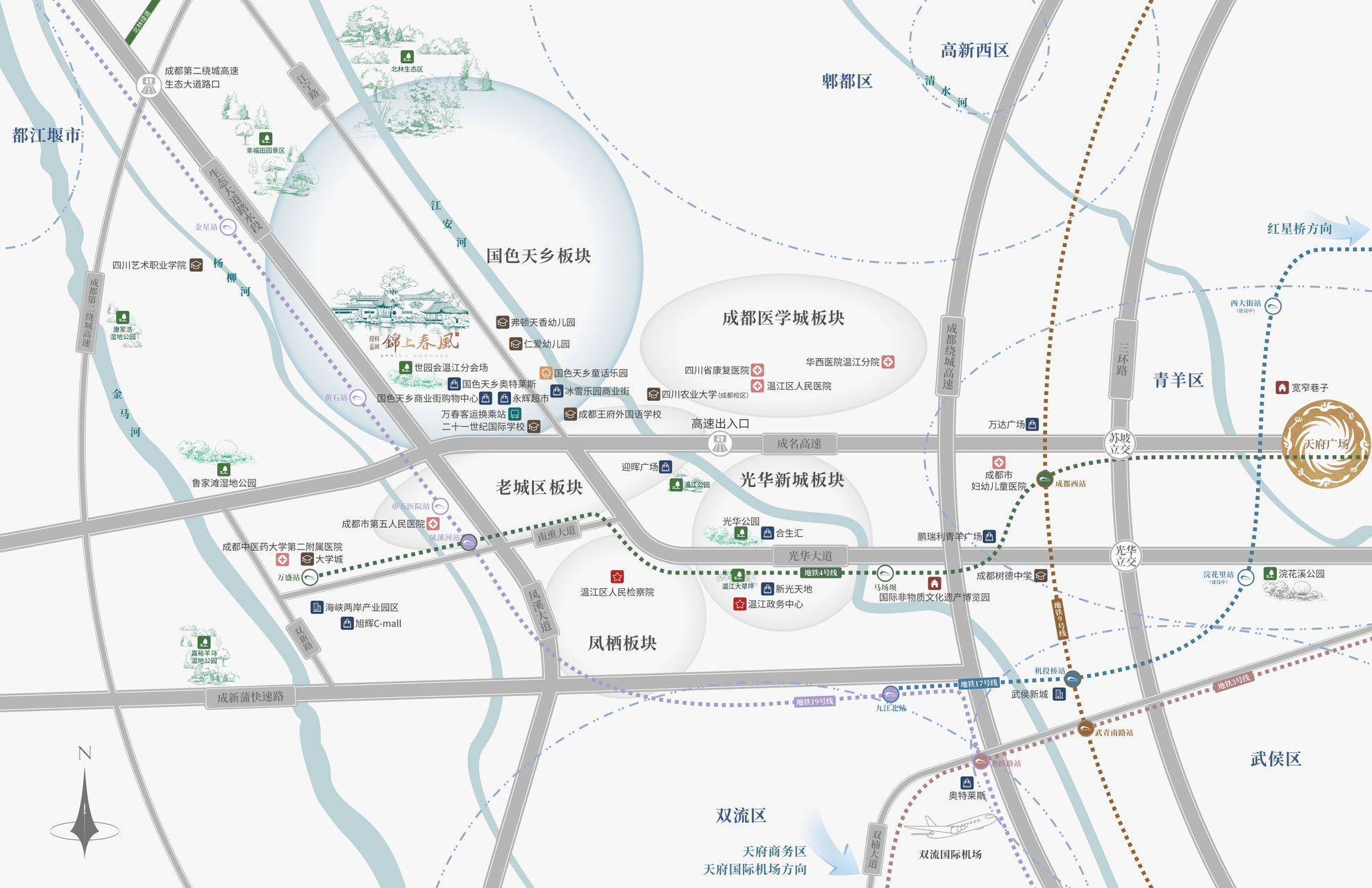 20分钟车程,可达华西医院温江分院、成都中医药大学温江分院,温江区人民医院、四川省八一康复中心、省人民医院温江医院等